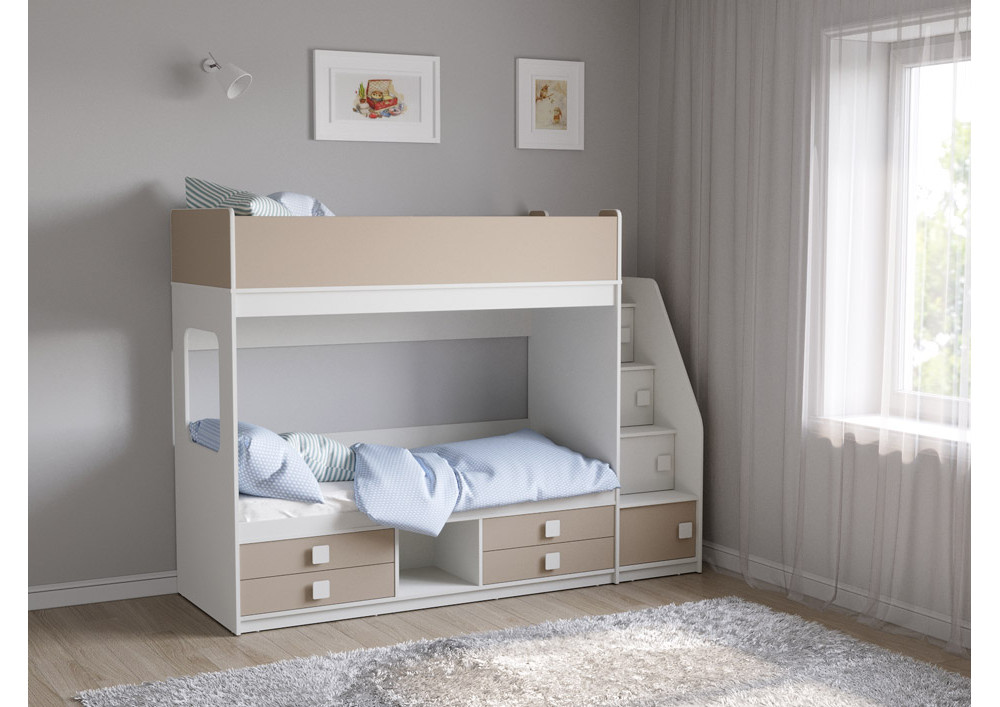Классическая детская двухъярусная кровать с двумя параллельными спальными местами размером 1750х750 и 1900х750, выдвижными ящиками для хранения и угловой лестницей-стеллажем.