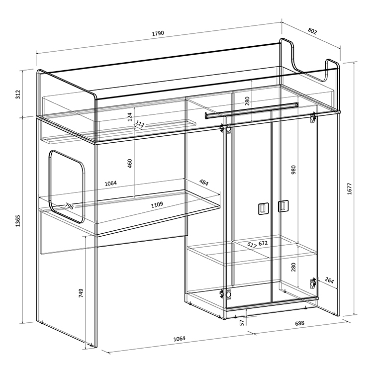 Высота кровати чердака всего 1677 мм.