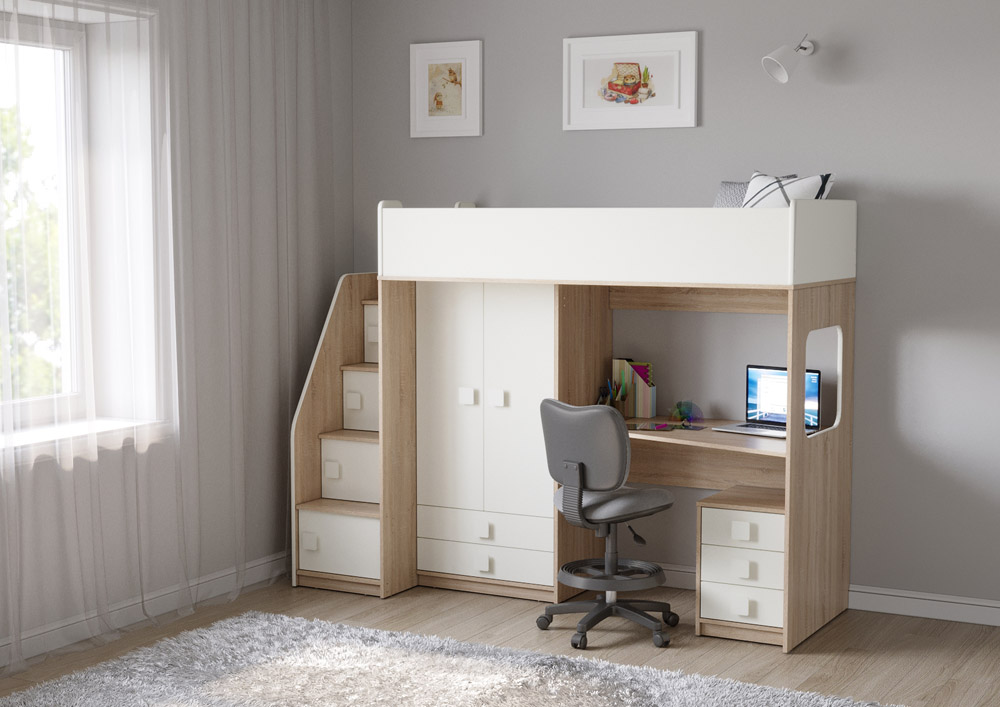Учебная зона со столом под спальным местом открывает возможности для письменных работ,а также здесь удобно расположить ноутбук. Вместительная тумба Л-04 отлично подойдет для хранения канцелярских принадлежностей и учебников.